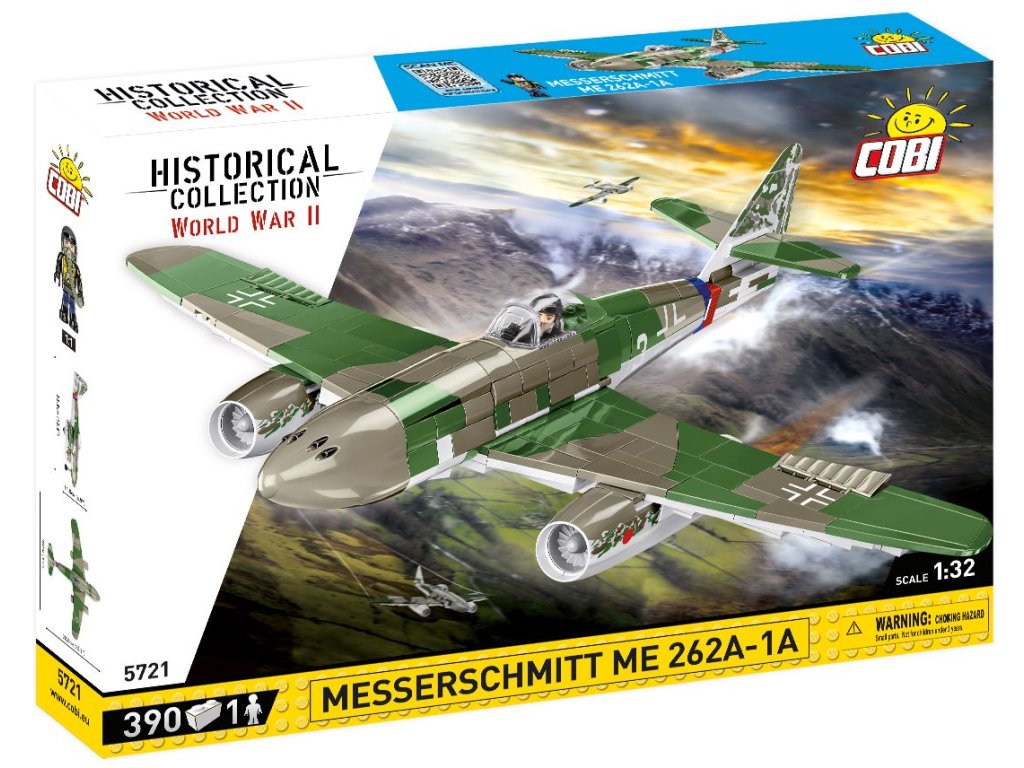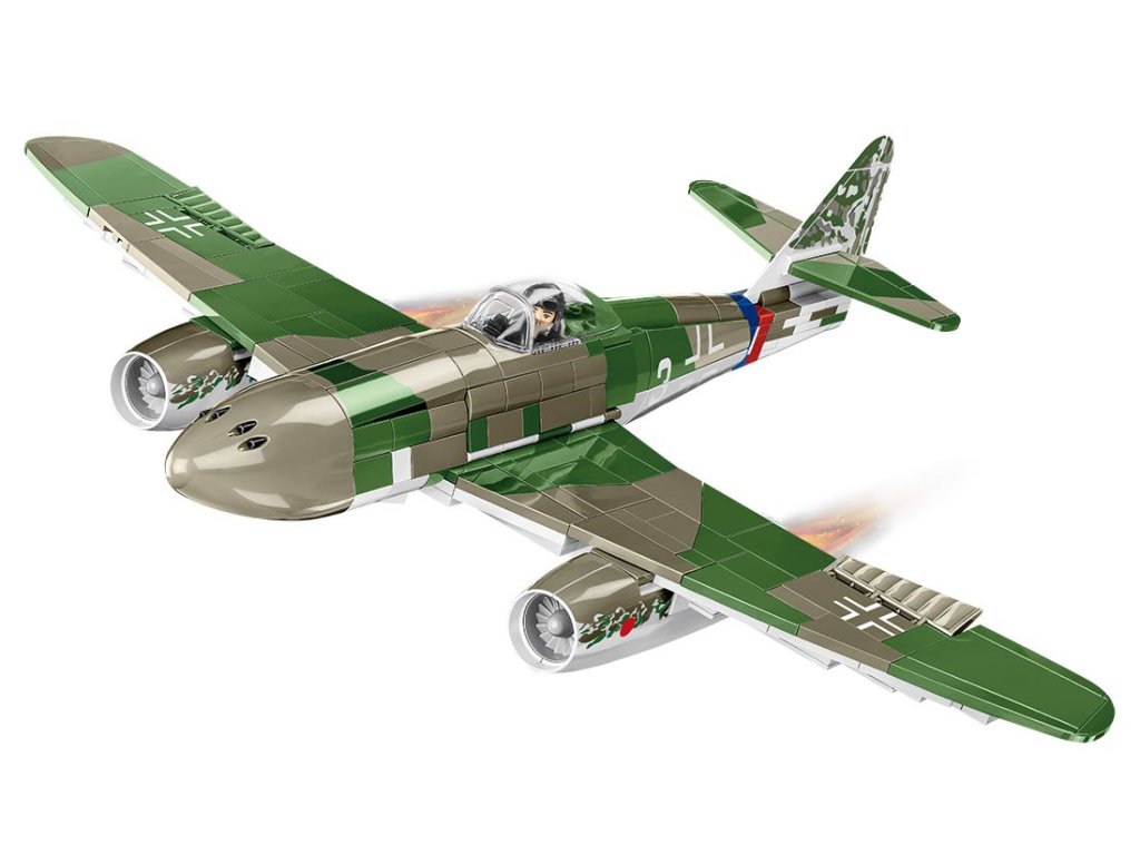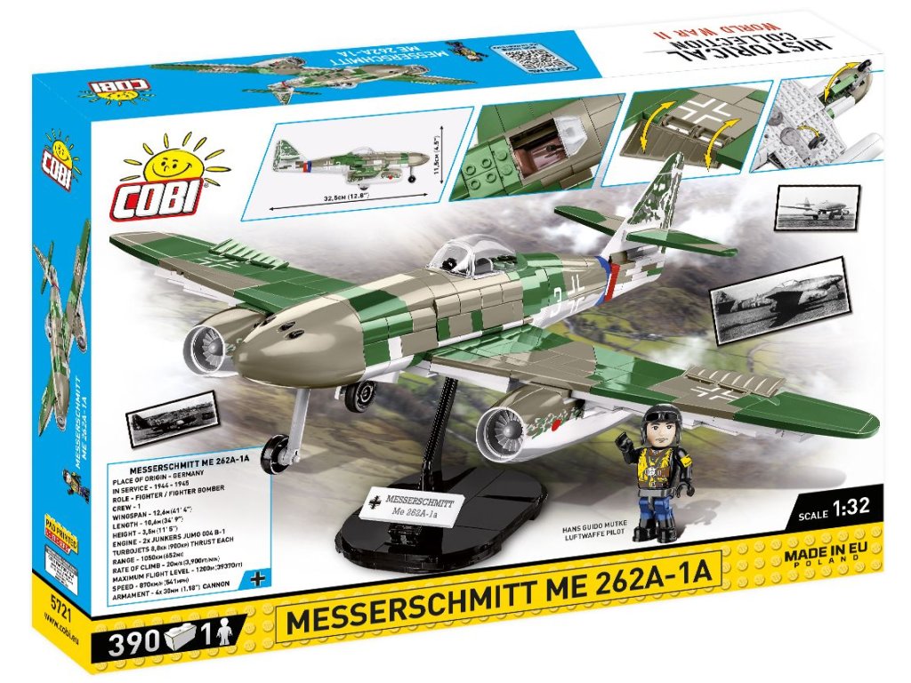 Postavte si model Messerschmittu Me 262 z 2. světové války. Model je v měřítku 1:32 a měří 32,5 x 11,5 a rozpětí křídel má 38 cm. Má mnoho funkčních částí. Balení obsahuje 390 kostek stavebnice a figurku pilota.