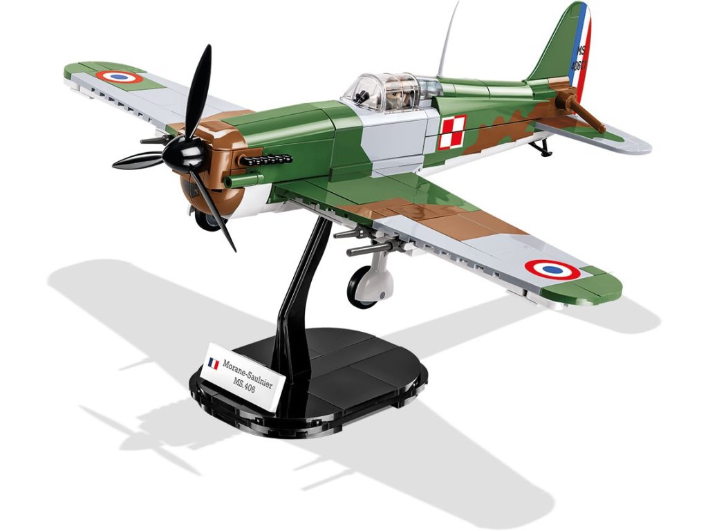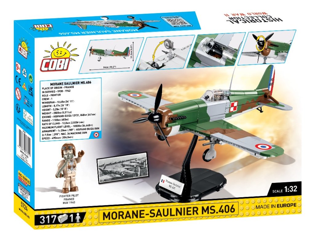 Postavte si model francouzského stíhacího letounu Morane-Saulnier MS.406. Model je v měřítku 1:32. Sestavený model má rozpětí křídel 32 cm, na délku 26 cm a na výšku 11,5 cm. Balení obsahuje 317 kostek stavebnice a figurku pilota.