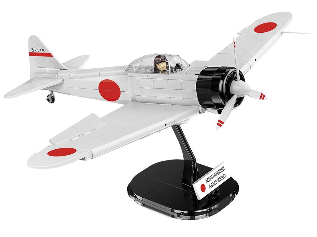 Mitsubishi A6M2 byl jedním z nejlepších stíhacích letounů na počátku 2. světové války. Navy Deck Fighter Model 0 neměl žádný oficiální název. Číslo 0 označuje konec roku 2600 v japonském kalendáři, ve kterém byl letoun navržen. Odtud pochází jeho přezdívka „zero“ vymyšlená Brity. Letoun navrhl inženýr Jirō Horikoshi v roce 1940 na objednávku japonského císařského námořnictva a během války byl neustále upravován. Stroj se vyznačoval vysokou rychlostí a manévrovatelností. Těchto vlastností bylo dosaženo mimo jiné na úkor opancéřování. Celkem bylo vyrobeno asi 11 000 exemplářů v různých verzích. Náš model je v měřítku 1:32 a sestavený měří 27 x 38 x 11,5 cm. Balení obsahuje 347 kostek stavebnice a figurku pilota.