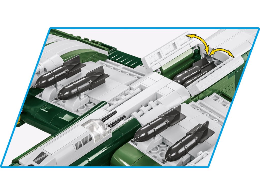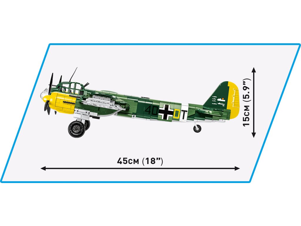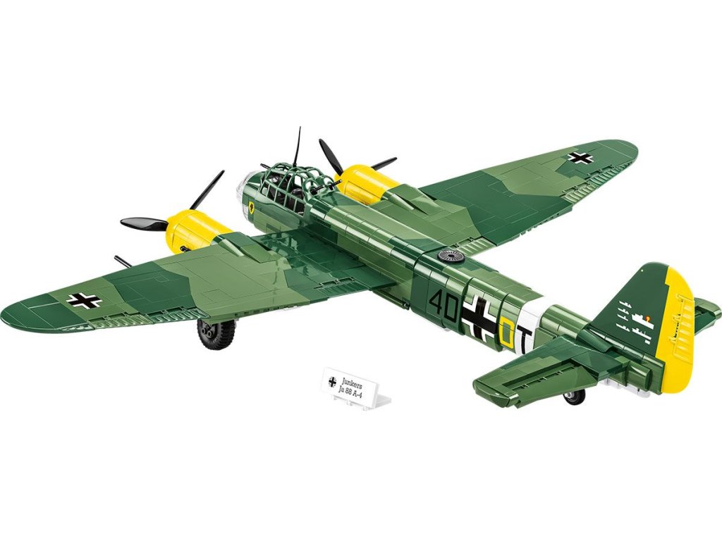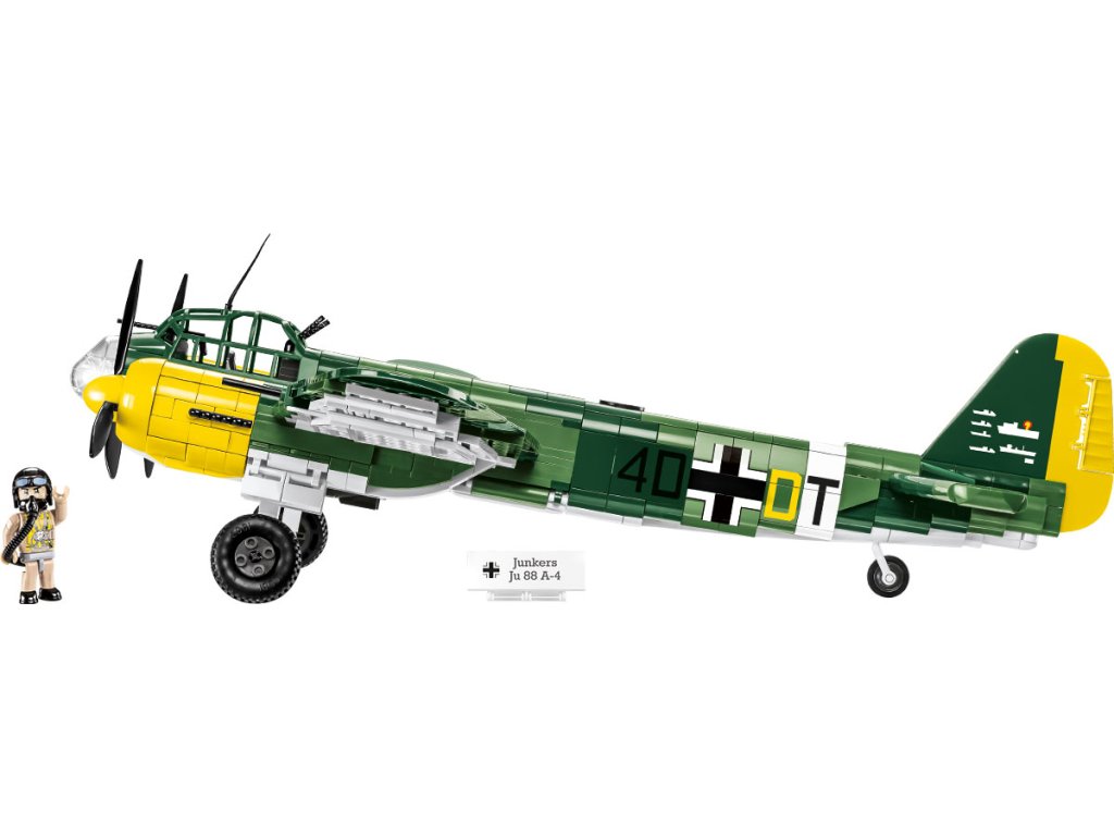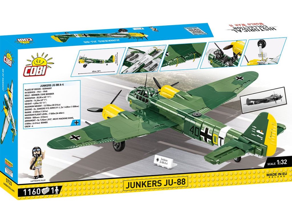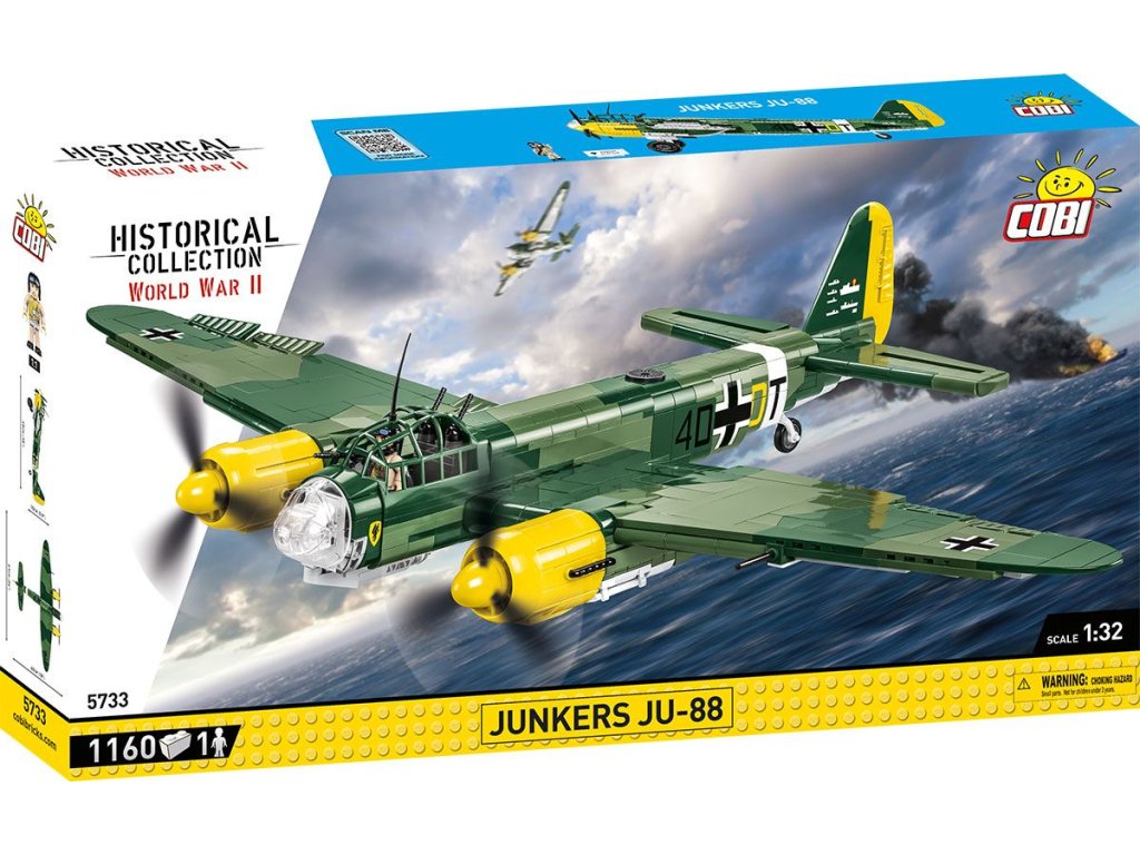 Bombardér Ju-88 je skutečným hitem mezi velkými letadly od Cobi a hvězdou Historical collection z období 2. světové války. Ju-88 byl německý dvoumotorový letoun s všestranným využitím. Získal přezdívku „německý moskyt“ - porovnejte s West de Havilland Mosquito, který má COBI také v nabídce! Ju-88 byl navržen jako vysokorychlostní bombardér, byl ideální pro útoky v malých výškách a mělké střemhlavé lety. Mohl také fungovat jako noční stíhač, torpédový bombardér a průzkumný letoun. A bylo to také jedno z nejpopulárnějších letadel 2. světové války! V letech 1939 - 1945 bylo vyrobeno téměř 15 000 exemplářů v mnoha verzích. Náš model je v měřítku 1:32 a sestavený měří 45 x 61 x 15 cm. Balení obsahuje 1 160 kostek stavebnice a figurku pilota.