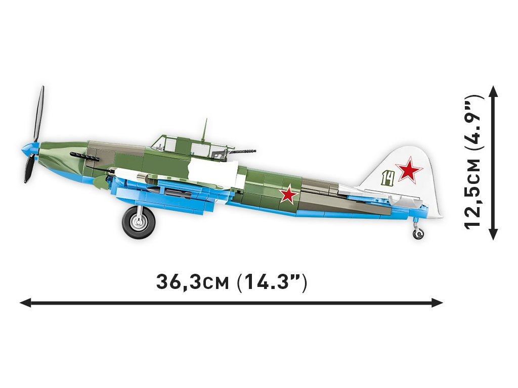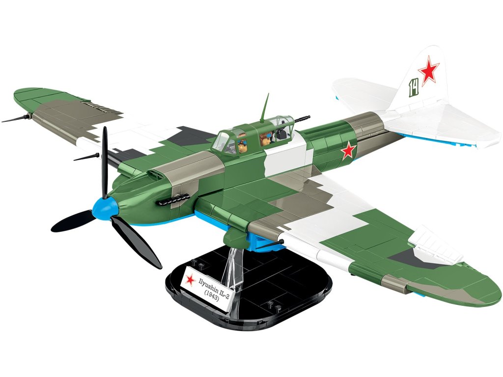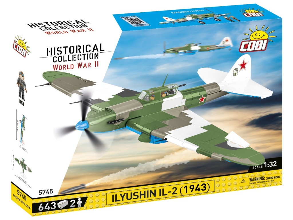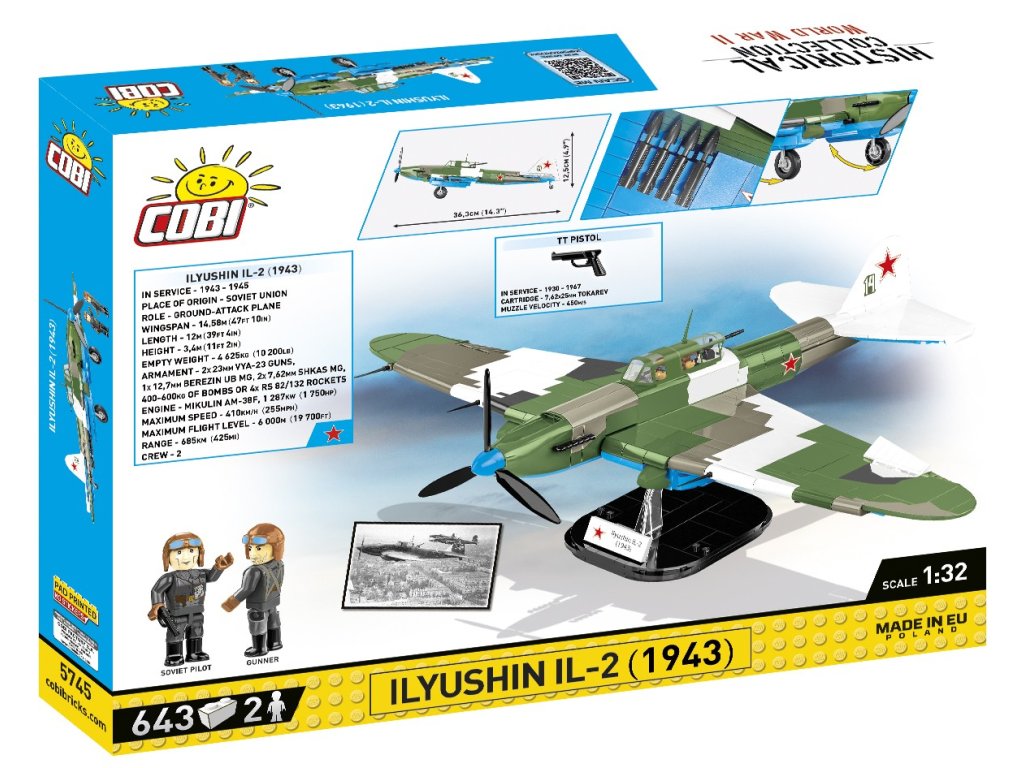 Letadlo IL-2 bylo navrženo z kostek stavebnice COBI v měřítku 1:32 s použitím nových prvků. Model nabízí mnoho pohyblivých prvků, jako je otočná vrtule, pohyblivá křidélka a kola s gumovými pneumatikami, která lze složit do vodorovné polohy. Reprodukovány byly detaily a historická zimní kamufláž. Modrá spodní strana letadla rozhodně poutá pozornost. Pilotní kabina byla přepracována a lze ji otevřít, aby se do sedadel usadily figurky pilota a střelce. Díky speciálnímu stojanu s plaketou s názvem letounu a místem pro uchycení figurek vypadá celá sada fantasticky! Model využívá odolné potisky znízorňující historické značení. Sada rozšiřuje sbírku letadel z 2. světové války vydanou v měřítku 1:32, určenou pro nadšence do historie, vojenské techniky a fanoušky nejkvalitnějšího stavění z kostek!