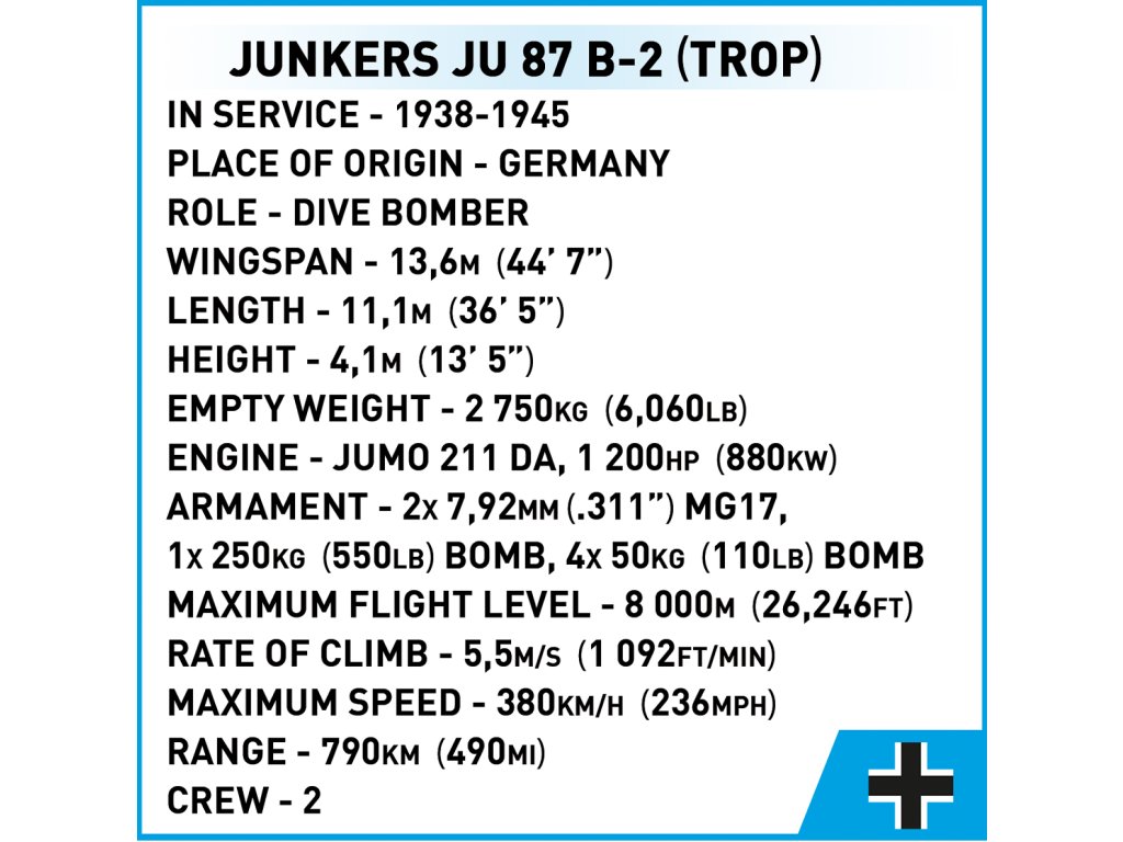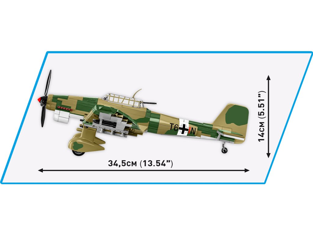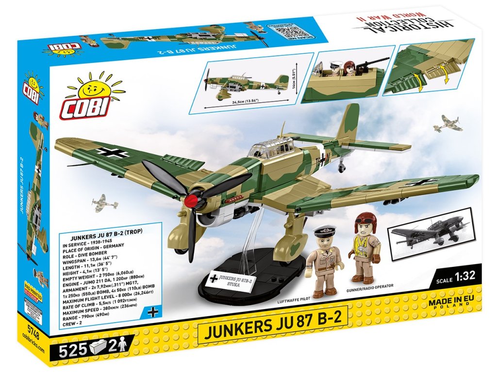 Postavte si model bombardéru Junkers Ju 87 „Stuka" z 2. světové války. Model je v měřítku 1:32 a měří 34,5 x 14 a rozpětí křídel má 42 cm. Má mnoho funkčních částí. Balení obsahuje 525 kostek stavebnice a 2 figurky: pilota a střelce/radistu.