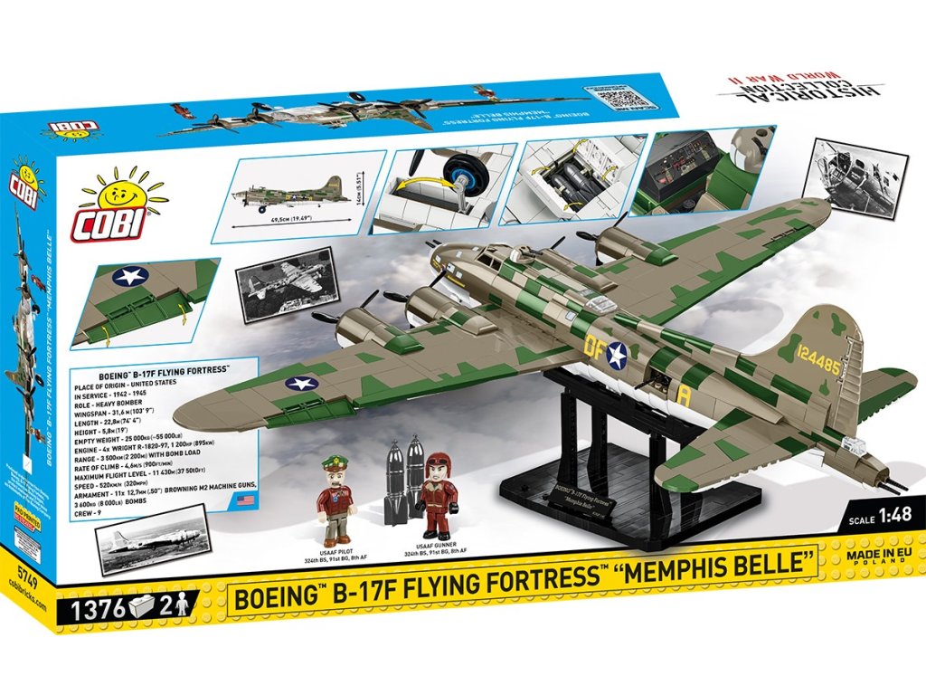 Postavte si model Létající pevnost B-17, zvané "Memphis Belle" z 2. světové války. Model je v měřítku 1:48 a měří 49,5 x 14 a rozpětí křídel má 66 cm. Má mnoho funkčních částí. Balení obsahuje 1 376 kostek stavebnice a 2 figurky pilotů.