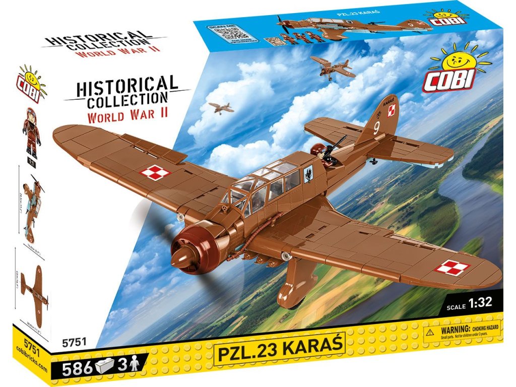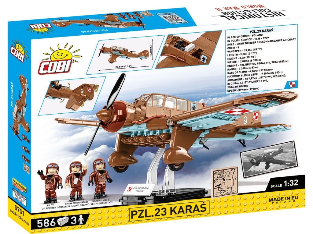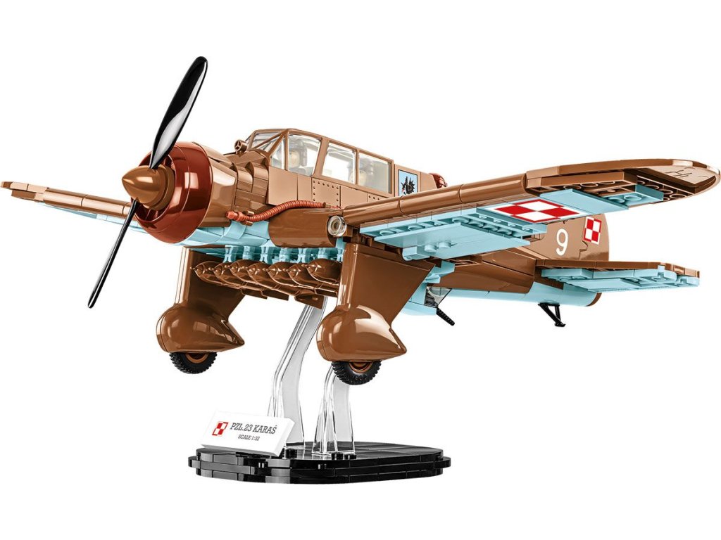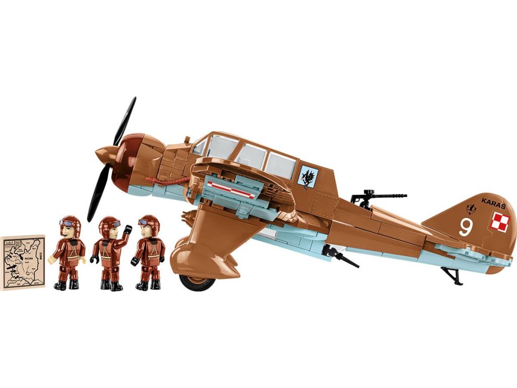 Legenda polského nebe z roku 1939 byla přesně reprodukována ze stavebnice COBI. Detailní model byl navržen v měřítku 1:32, které odpovídá dalším letadlům z Historical collection. Pro tento model byla vytvořena zcela nová kostka ve tvaru charakteristického krytu kokpitu, který pojme tři figurky posádky. Letadlo má natištěné historické značení, které je také na spodní straně křídel. Spodní část letounu je vyrobená z nových světle modrých kostek. Kromě kulometů PZL.23 je Karaś vybaven sadou připínacích pum. Figurky letců v charakteristických kožených oblecích mají potisky také na zádech a vypadají fantasticky. Sada obsahuje impozantní kostku s tištěnou mapou zobrazující situaci v Polsku v prvních dnech roku 1939. Tento úžasný model polského bombardéru lze umístit na pohyblivá kola nebo na podstavec s průhlednými prvky. Celou sadu doplňuje plaketa s názvem modelu. Tato nádherná historická sada nejen připomíná polské piloty, ale je také svědectvím o vojenské technice té doby. Karasy byli mezi prvními, kteří bojovali v těžkých bitvách na samém začátku 2. světové války! Postavte si historii, kostku po kostce.