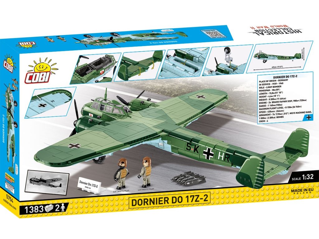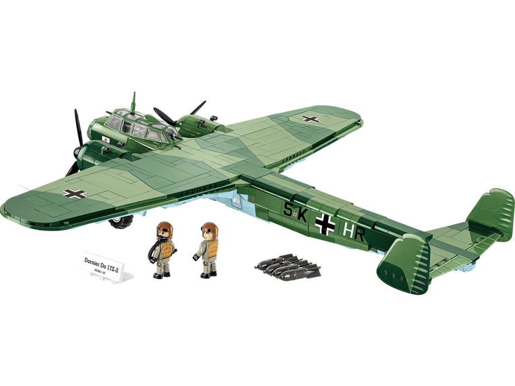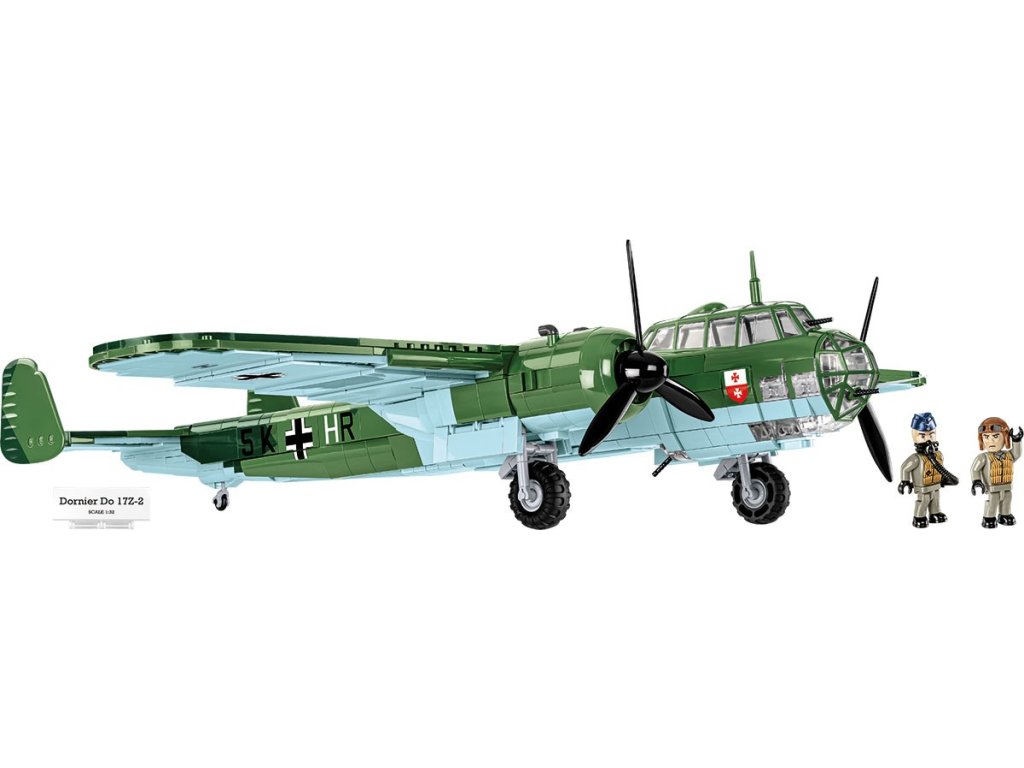 Postavte si model slavného bombardéru Dornier DO 17 z 2. světové války. Model je v měřítku 1:32 a měří 49 x 13 a rozpětí křídel má 57,5 cm. Má mnoho funkčních částí. Balení obsahuje 1 383 kostek stavebnice a 2 figurky pilotů.