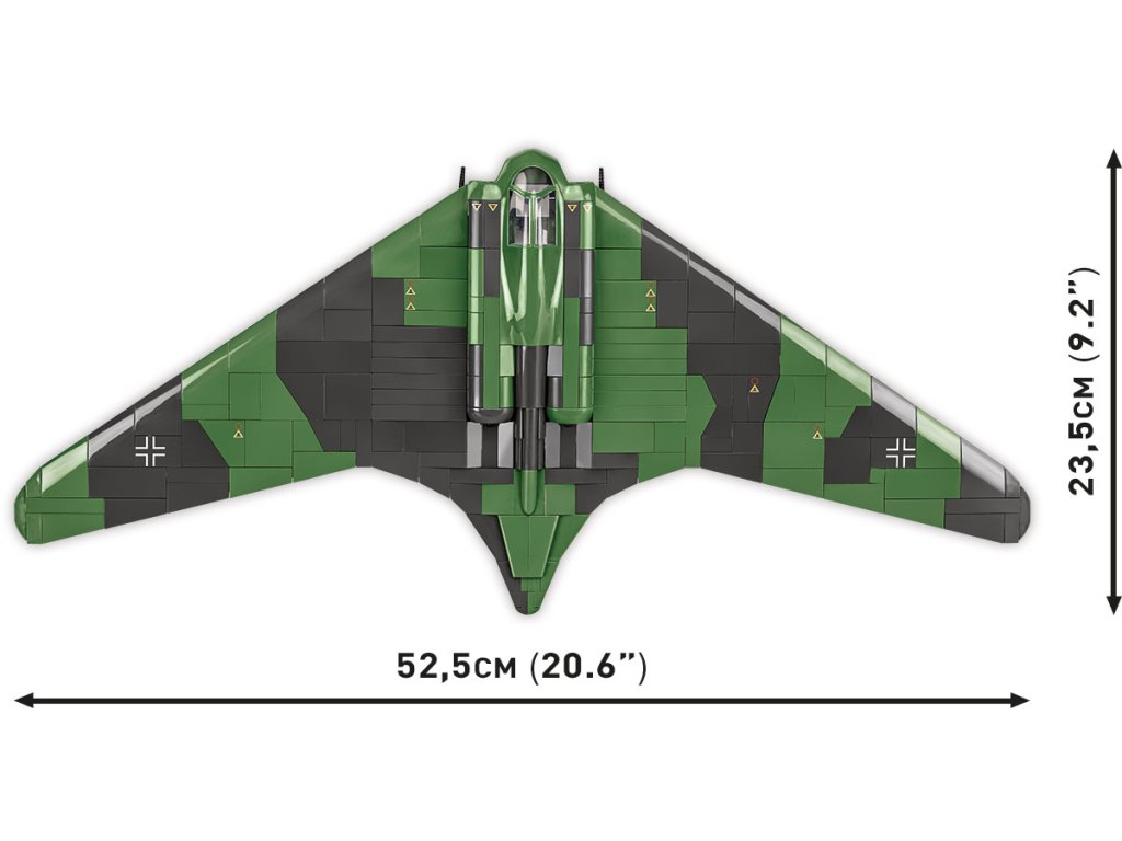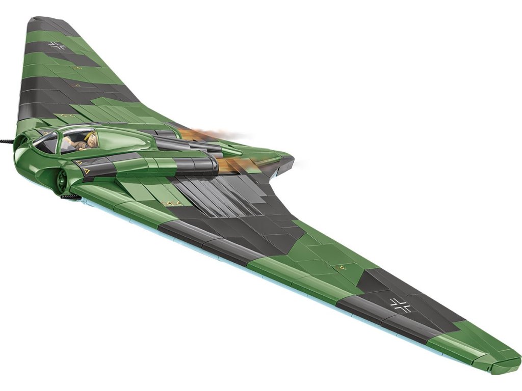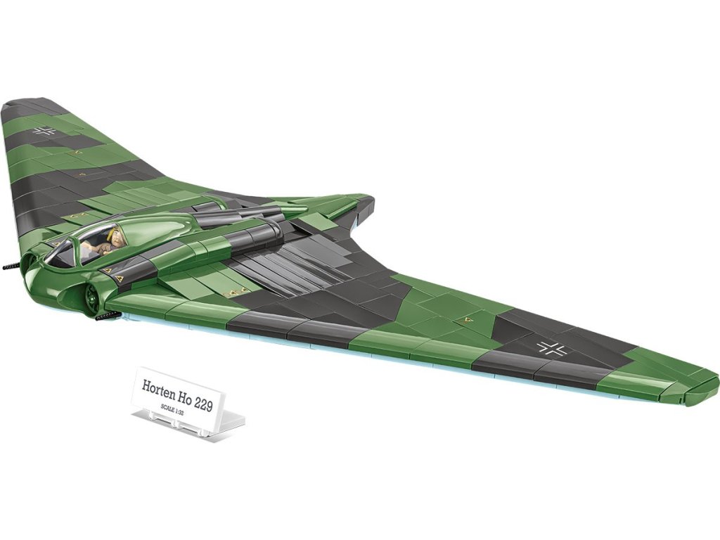 Postavte si model futuristického letounu Horten Ho 229 z 2. světové války. Model je v měřítku 1:32 a měří 23,5 x 10 cm a rozpětí křídel má 52,5 cm. Má mnoho funkčních částí. Balení obsahuje 953 kostek stavebnice a figurku testovacího pilota.