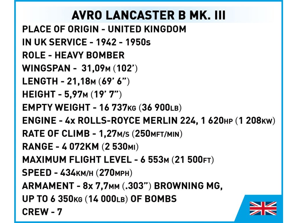 Avro Lancaster B Mk.I/III bylo klíčovým prvkem britské bombardovací strategie během 2. světové války. Jeho schopnost nést velký bombový náklad, odolnost a všestrannost z něj dělaly jeden z nejúčinnějších a nejuniverzálnějších bombardérů používaných Spojenci. Nový model má označení polské 300. bombardovací perutě „Ziemia Mazowiecka“. Model má pohyblivé vrtule, zatahovací podvozek, otevírací pumovnici s bombami, plaketu s názvem sady, přesně reprodukovaný interiér a figurku polského pilota z 300. bombardovací perutě.