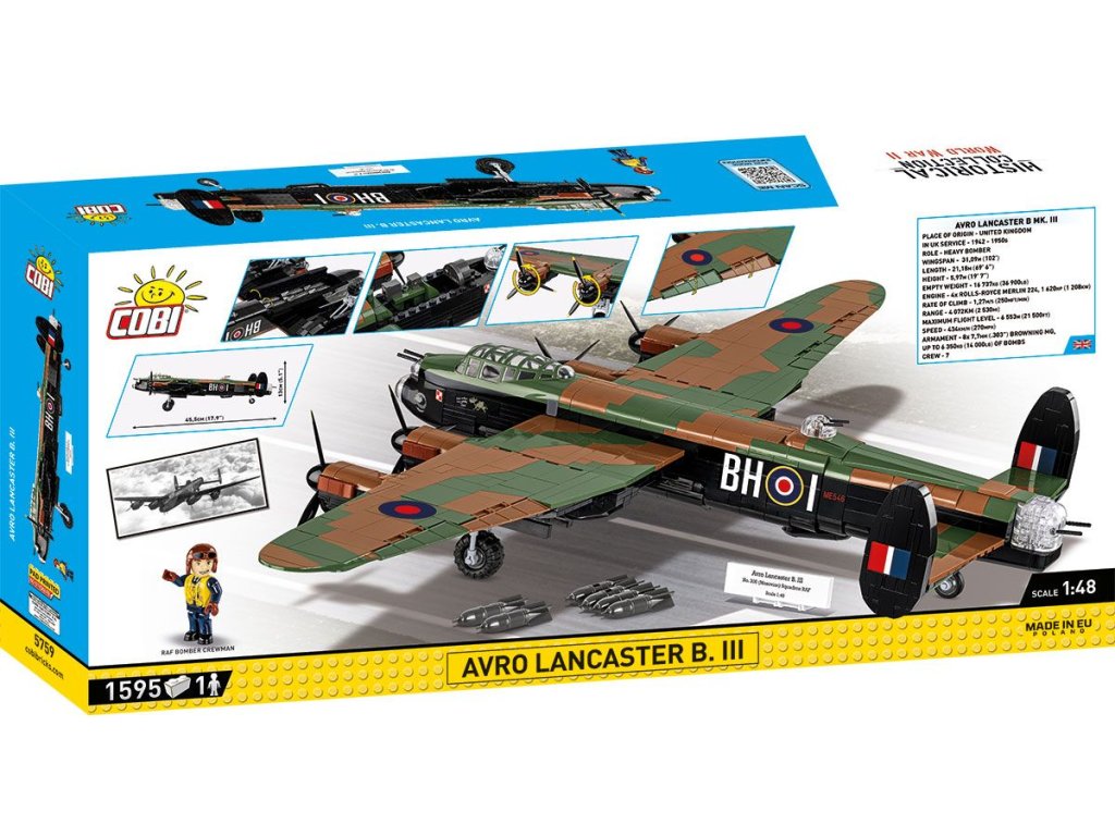 Postavte si model letounu Avro Lancaster z 2. světové války. Model je v měřítku 1:48 a měří 45,5 x 13 cm a rozpětí křídel má 64,5 cm. Má mnoho funkčních částí. Balení obsahuje 1 595 kostek stavebnice a figurku pilota.