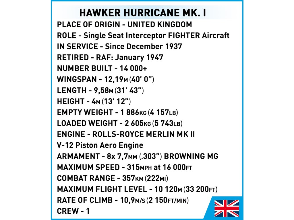 Objevte legendární stíhací letoun britského královského letectva, který sehrál klíčovou roli v bitvě o Británii. Stavebnice COBI Vám umožní postavit realistický model Hawker Hurricane, v barvách polské 302. perutě RAF, která se v roce 1940 proslavila svým hrdinstvím a bojovou odvahou.
