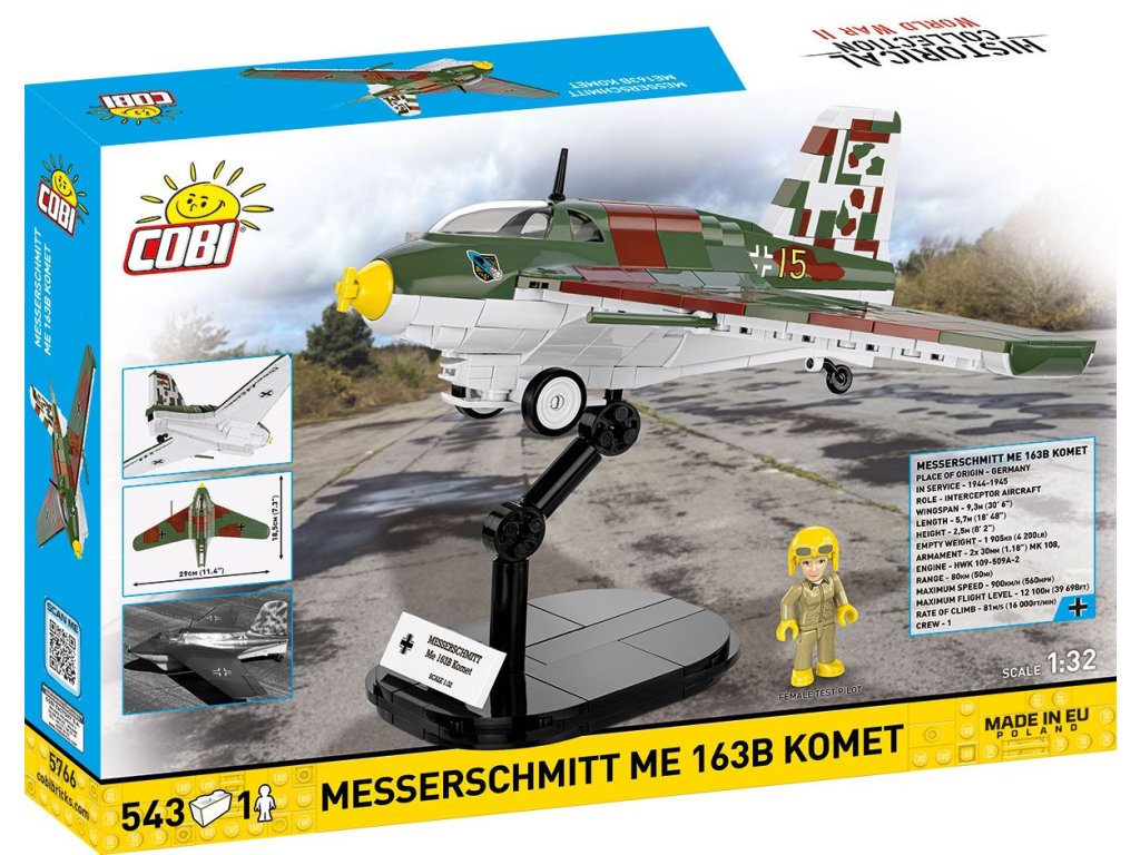 Postavte si model Messerschmittu Me 163B "Komet" z 2. světové války. Model je v měřítku 1:32 a měří 18,5 x 8,5 cm a rozpětí křídel má 29 cm. Má mnoho funkčních částí. Balení obsahuje 543 kostek stavebnice a figurku pilotky v uniformě.