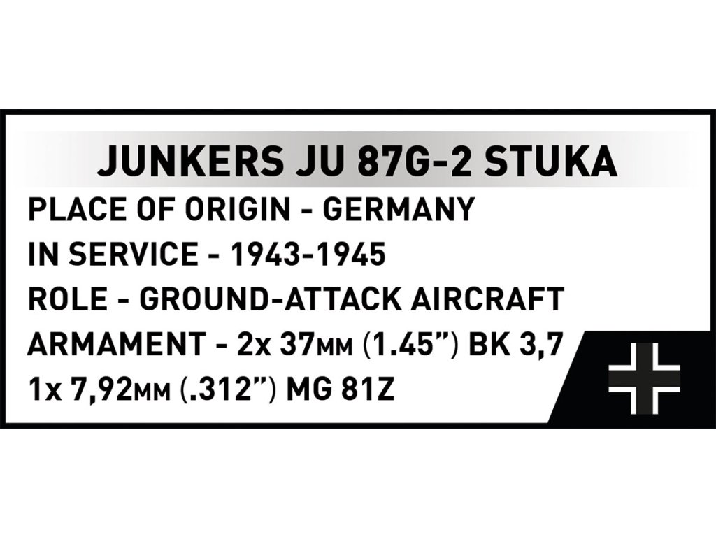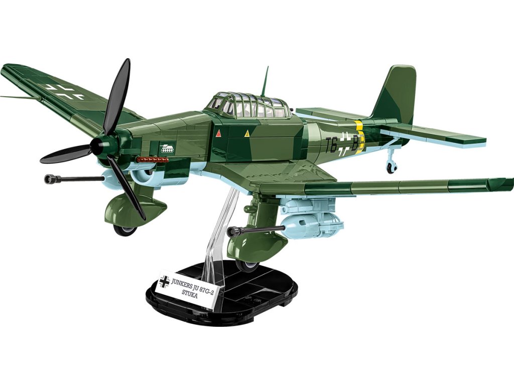 Junkers Ju 87 je jednou z nejslavnějších konstrukcí letounů 20. století. Poprvé vzlétl v roce 1935 a rychle se stal symbolem německého vojenského letectva a nástrojem pro přesné útoky na pozemní cíle. Verze Ju 87 G-2 „Gustav“, známá jako stíhač tanků, byla navržena pro maximální efektivitu v drsných podmínkách východní fronty. Náš model z kostek stavebnice věrně zachycuje charakter této verze: od masivní výzbroje, přes proporce trupu, až po detaily, které ocení každý fanoušek vojenské historie.