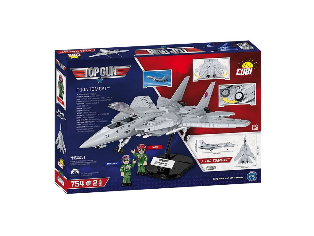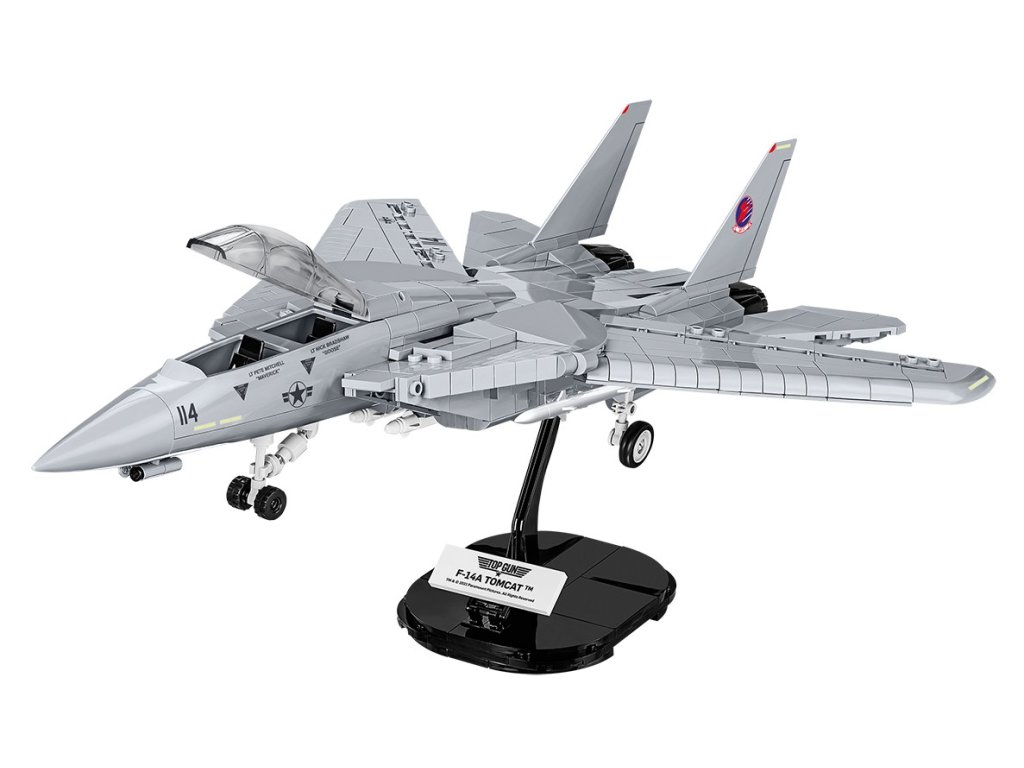 Náš TOMCAT je unikátní model letounu vydaný v licenci TOP GUN™ a NORTHROP GRUMMAN. Legendární filmový pilot Pete "Maverick" Mitchell a jeho partner "Goose" létají právě s takovým dvoumístným letounem. Prožijte znovu vzrušení z TOP GUNu a postavte si vlastní F-14 v měřítku 1:48. Model byl věrně reprodukován ze 757 kostek stavebnice COBI. Má vysoce kvalitní potisky, které věrně reprodukují originální značení filmového letounu. Model je vybaven pohyblivými křídly s proměnnou geometrií, zatahovacím podvozkem a otočnými koly. Pod křídly se nachází velký arzenál zbraní. Do kabiny můžete umístit oba filmové piloty a jejich sedadla jsou dokonce podepsaná (Maverick a Goose)! Figurky přesně reprodukují vzhled filmových hrdinů a jsou vybaveny charakteristickými helmami a kyslíkovými maskami. Sada obsahuje také elegantní stojánek na vystavení modelu s plaketou s názvem letounu a logem filmu. Tato exkluzivní licencovaná sada je rozhodně skvělým dárkem pro každého fanouška filmu, letectví a armády bez ohledu na věk. Letoun vypadá perfektně v elegantní pracovně nebo v pokoji teenagera.