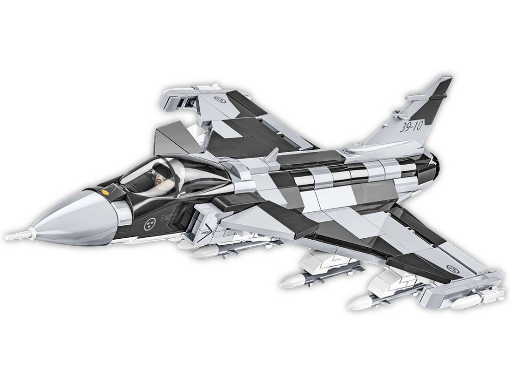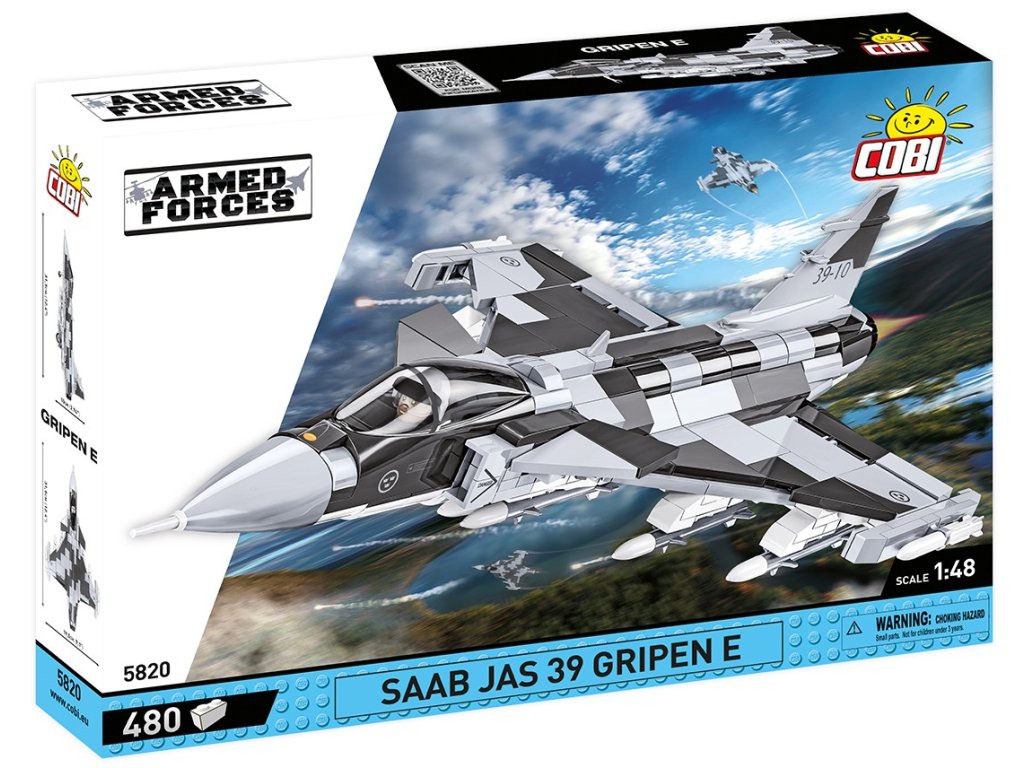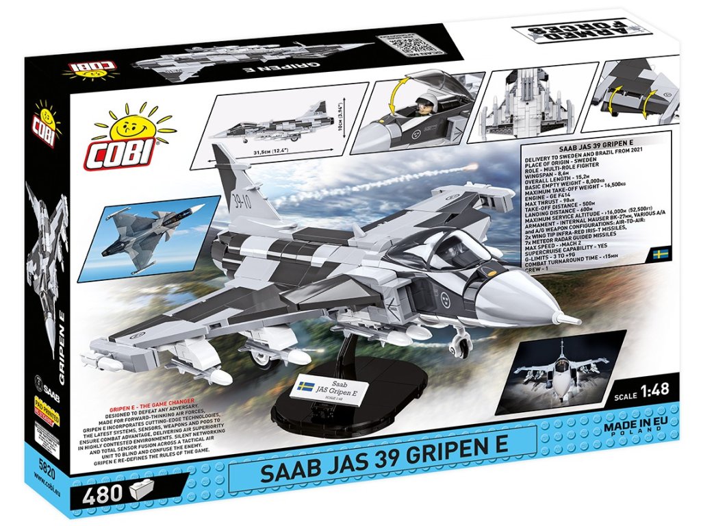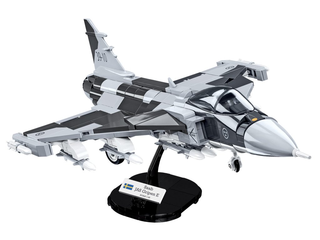 JAS 39 Gripen E je nejmodernější vývojová verze populárních švédských víceúčelových stíhaček, vyráběných leteckou společností SAAB. Název letounu Gripen znamená gryf a zdůrazňuje víceúčelovost letounu. Zkratka JAS vznikla ze švédských slov: Jakt - lov, Attack - přepadení, Spaning - průzkum. Gripen je vysoce výkonný, víceúčelový stroj, který je schopen plnit všechny tyto úkoly. Konfigurace kachny a křídla v konfiguraci delta umožňují vyvinout vysoké rychlosti. Verze „E“ je vyvíjena pro potřeby švédského a brazilského letectva. Letoun se mírně prodloužil, zvětšilo se i rozpětí křídel a hmotnost. Konstruktéři informují o revolučních změnách v avionice, nárůstu výkonu motoru o 22 procent a doletu prodlouženém na 4075 km. Modernizován byl i pilotní kokpit. JAS-39 Gripen E je stíhačka nabitá nejmodernějšími technologiemi. Pilot chráněný elektronickými senzory a systémy umělé inteligence se může soustředit na misi. Model je v měřítku 1:48 a sestavený měří 31,5 x 19,5 x 10 cm. Balení obsahuje 480 kostek stavebnice.