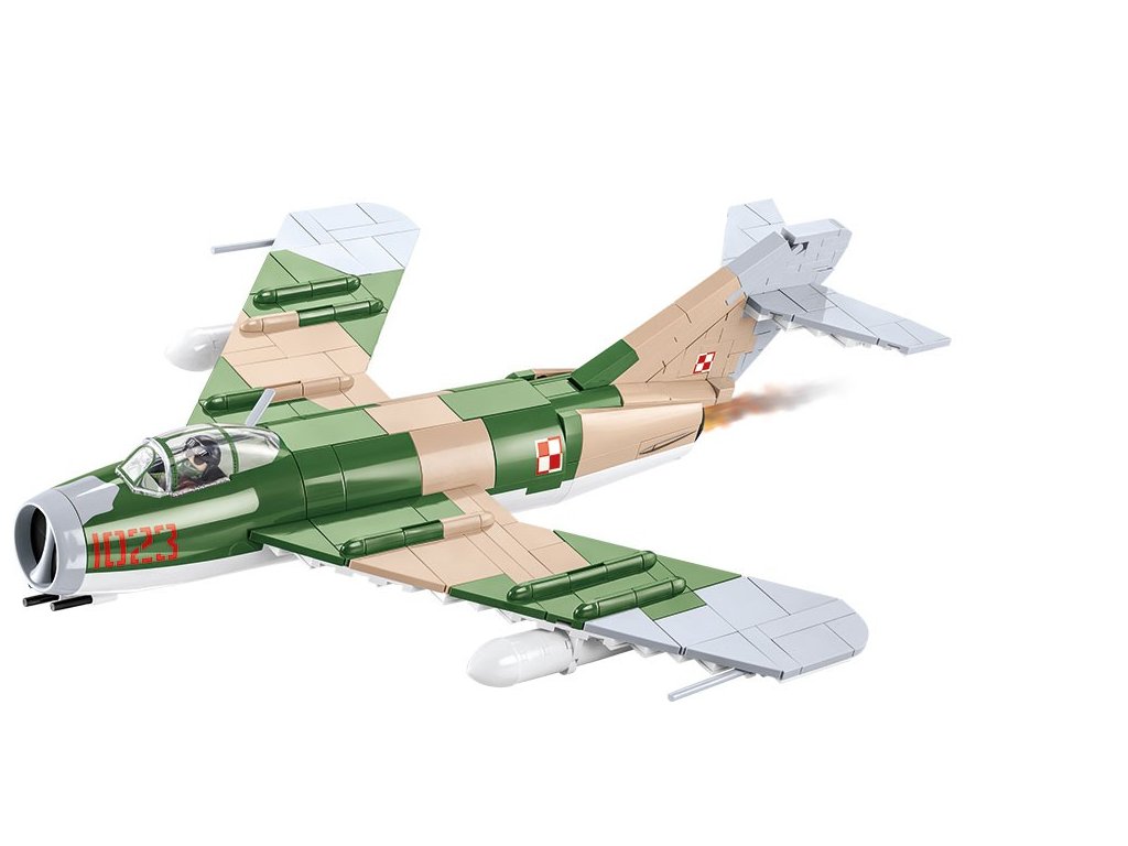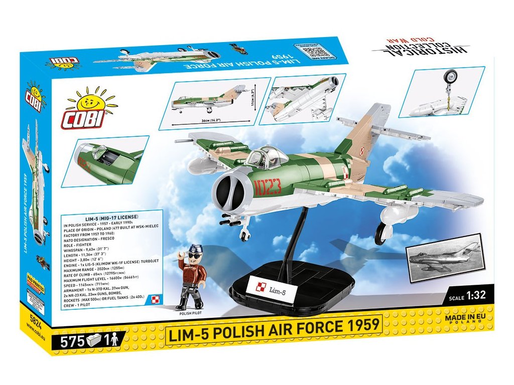Model letounu LIM-5 (MIG-17F) byl navržen v měřítku 1:32 a skládá se z 575 vysoce kvalitních prvků COBI. Všechny značky a nápisy na modelu jsou potisky, které se během používání nestírají. Sada má pohyblivé prvky, jako jsou kola a otevírací kabina, do které můžete umístit senzační figurku polského pilota, doplněnou znakem polského letectva. Kamufláž reprodukovaná z kostek je obzvláště krásná. Sada obsahuje stojánek na vystavení modelu s plaketou s názvem letounu a označením státní příslušnosti.