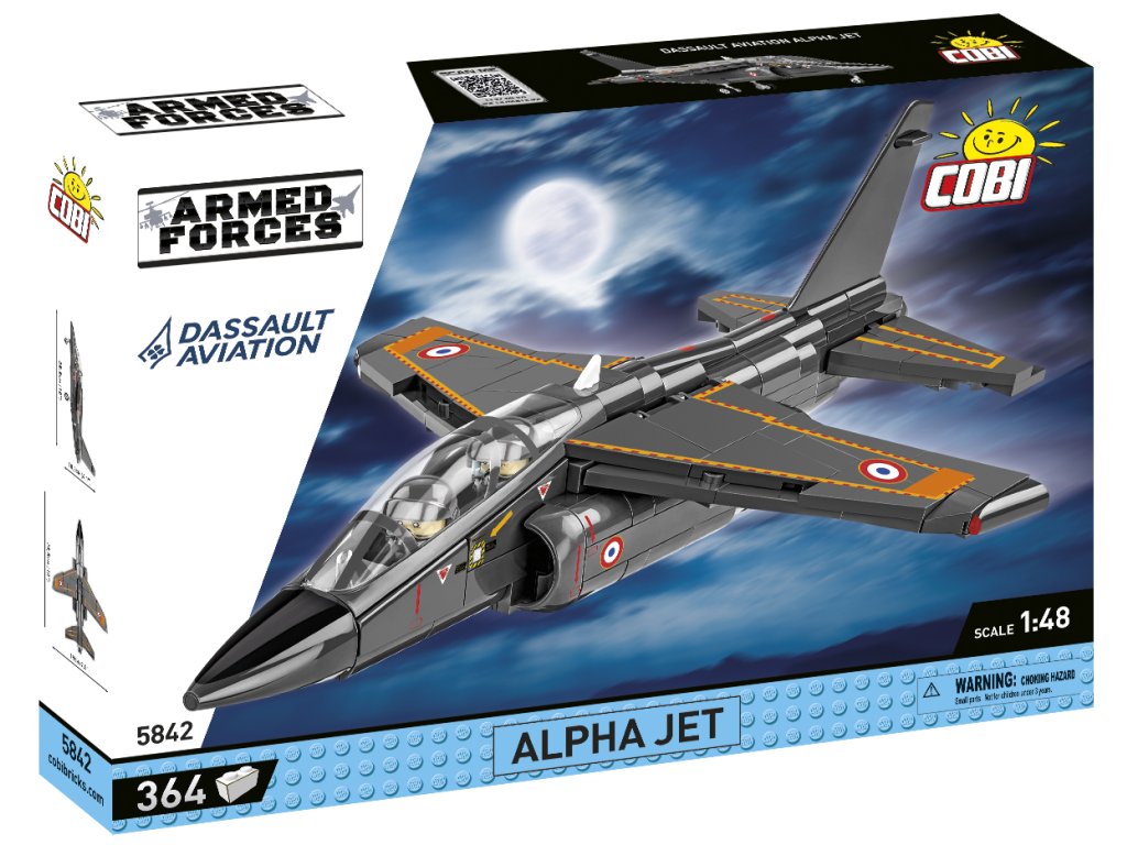 Postavte si model letounu Alpha Jet. Model je v měřítku 1:48 a měří 25,5 x 10,5 cm a rozpětí křídel má 19 cm. Má mnoho funkčních částí. Balení obsahuje 364 kostek stavebnice.