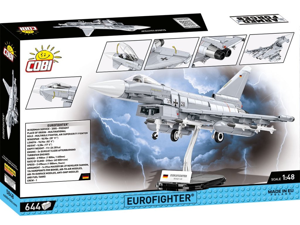 S 644 vysoce kvalitními kostkami stavebnicemi COBI si můžete postavit víceúčelovou stíhačku EUROFIGHTER® v barvách německého letectva. Model byl pečlivě navržen v měřítku 1:48 a rozšiřuje kolekci Ozbrojených sil (Armed Forces). Má otevírací kokpit, pohyblivá křidélka a kola. Podvozek lze kdykoli snadno odpojit a letoun vystavit na stojánek, který je součástí balení. Součástí balení je i plaketa s označením letounu. Díky intuitivnímu návodu je stavba jednoduchá a nezpůsobí problémy ani méně pokročilým stavitelům. Kostky mají vysoce kvalitní potisky, které se neopotřebovávají ani při intenzivním používání. Sada rozhodně splní očekávání nadšenců do letectví, armády a stavění z kostek. Eurofighter® bude skvěle vypadat ve vaší sbírce ozbrojených sil.