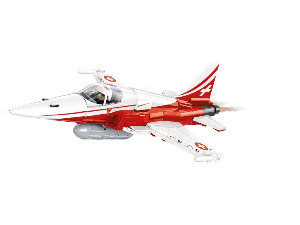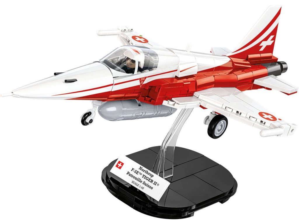 Postavte si model letounu F-5 Tiger II v barvách slavného akrobatického týmu švýcarského letectva Team Patrouille Suisse. Model je v měřítku 1:48 a měří 29 x 10 cm a rozpětí křídel má 17 cm. Má mnoho funkčních částí. Balení obsahuje 351 kostek stavebnice. Vyrobeno v licenci Northrop Grumman.