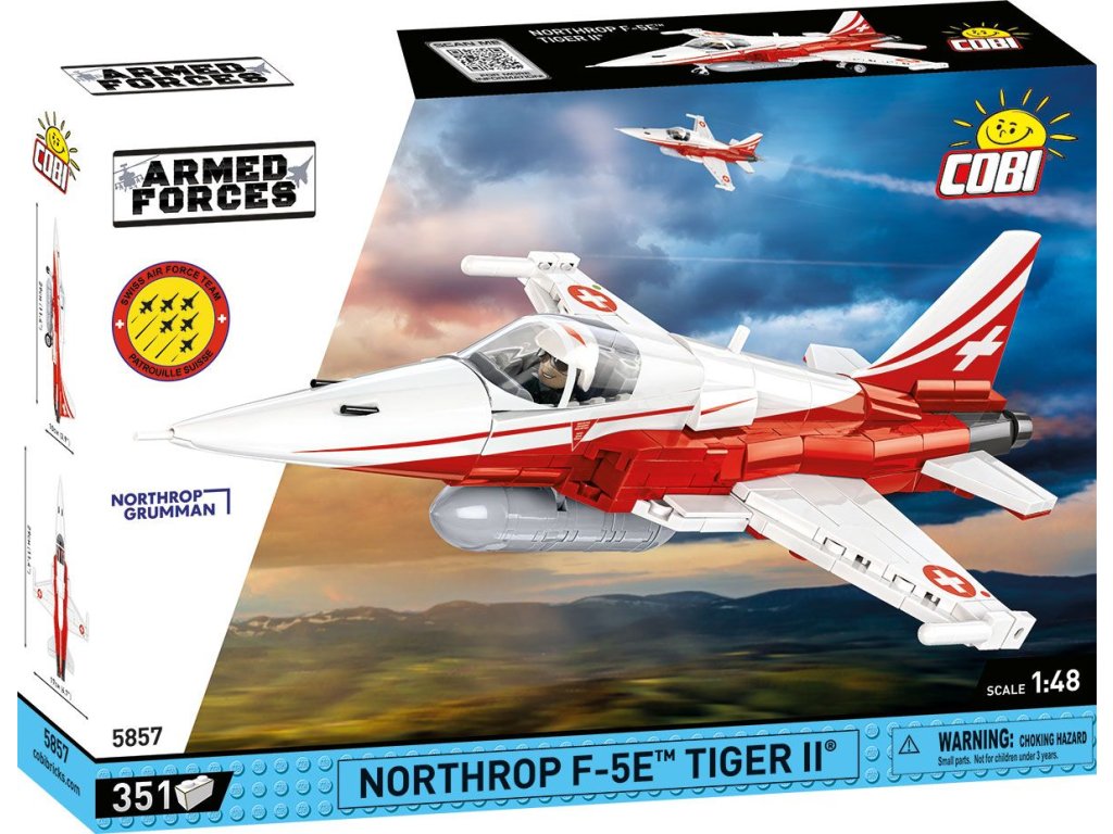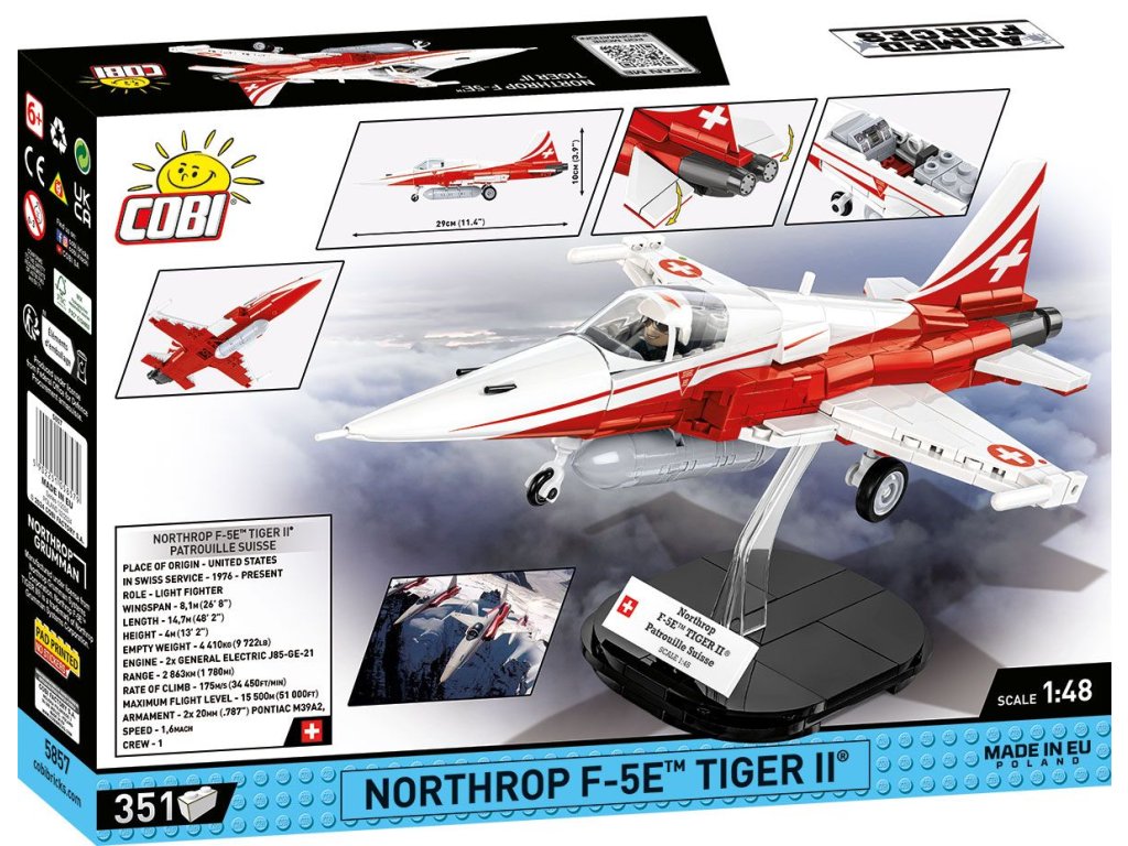 S využitím 351 kostek stavebnice COBI si můžete postavit stíhací letoun F-5 Tiger II v barvách slavného akrobatického týmu švýcarského letectva Team Patrouille Suisse. Licencovaná sada byla postavena na základě plánů letounu F-5 s maximálním důrazem na detaily. Letoun má charakteristické krásné červené potisky, pohyblivá křidélka a odnímatelný podvozek. Kokpit se otevírá a lze do něj umístit zjednodušenou figurku pilota s helmou. Sada obsahuje také výstavní stojánek a plaketu s názvem letounu, měřítkem a švýcarskou vlajkou. Model v měřítku 1:48 rozšiřuje kolekci letadel Armed Forces (Ozbrojené síly). Postavte si historii, kostku po kostce.