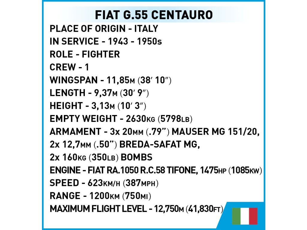 Letadlo, vyrobené ze 192 prvků, vnáší do sbírky COBI nádech středomořské svěžesti. Model má kamufláž z operačního prostoru ve Středomoří. Emblém italského letectva je prezentován odolnými a nesmazatelnými potisky.