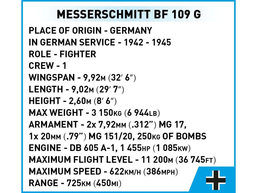 Messerschmitt Bf 109 byl jedním z nejpoužívanějších stíhacích letounů 2. světové války. Verze G (Gustav) se objevila v roce 1942 a vyráběla se ve velkém množství až do konce války. Letoun byl nasazen na všech frontách a stal se symbolem německého Luftwaffe. Bf 109 G vynikal vysokou rychlostí, obratností a silnou výzbrojí. Používal se jak k ochraně německého vzdušného prostoru, tak k útokům na bombardéry a bojům ve vzduchu.