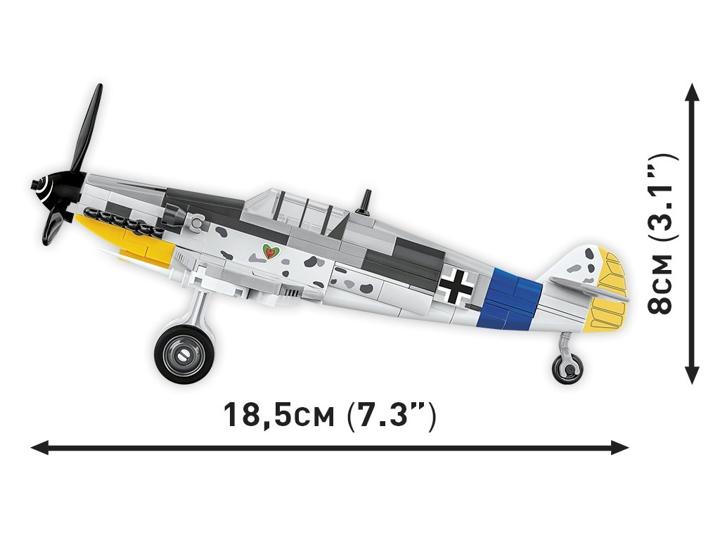 Postavte si model legendárního německého stíhacího letounu Messerschmitt Bf 109 G z 2. světové války. Model je v měřítku 1:48 a měří 18,5 x 8 cm a rozpětí křídel má 21 cm. Balení obsahuje 125 kostek stavebnice.