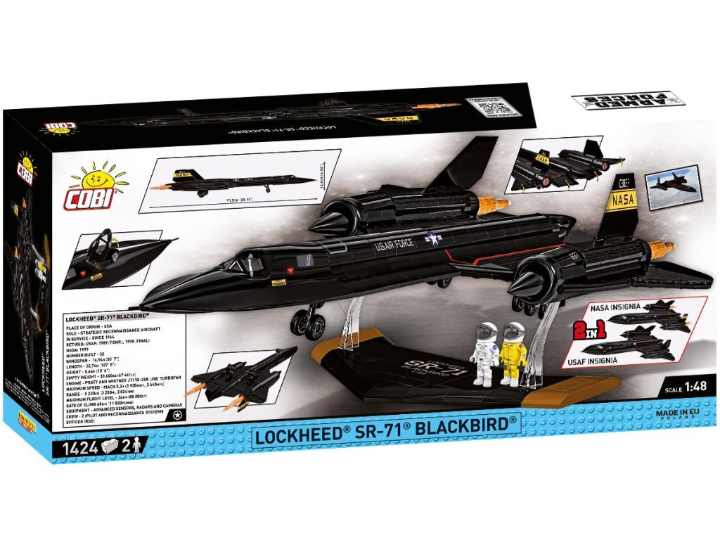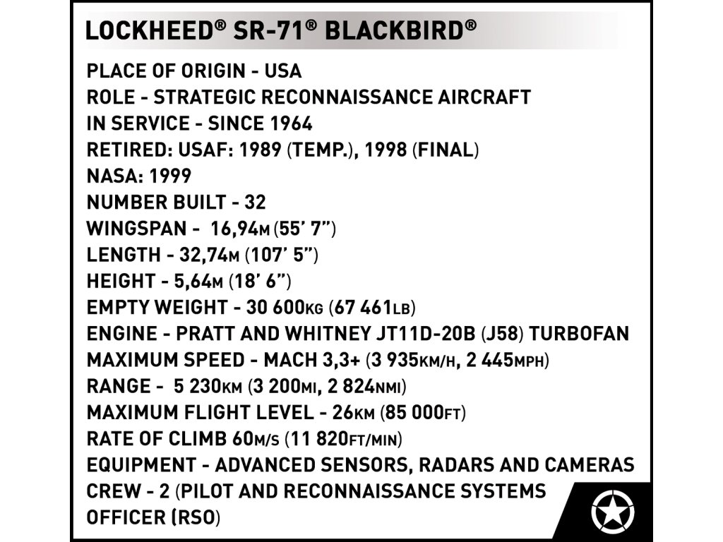 SR-71 Blackbird je jedním z nejikoničtějších strojů v historii letectví, který po celá desetiletí vzbuzuje obdiv a respekt. Nyní si tuto legendu můžete přinést domů. Je to nejrychlejší letoun, jaký kdy byl uveden do operační služby ve vojenském letectvu. Byl navržen na přelomu 50. a 60. let 20. století pro CIA, ale provozovaly ho také NASA a USAF. SR-71 je strategický průzkumný letoun s dlouhým doletem, dosahující rychlosti 3,5 Machu a výšky 26 000 metrů, což ho pro tehdejší obranné systémy činilo nevysledovatelným. Celkem bylo vyrobeno 32 letounů SR-71. Vzhledem k velmi vysokým nákladům na údržbu tohoto letounu a infrastruktury nezbytné pro jeho provoz byl na konci 80. let stažen z provozu. Nyní roli letounu SR-71 převzaly průzkumné satelity a drony. Poslední let tohoto typu letadla se uskutečnil 9. října 1999.