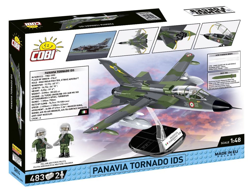 Se 483 vysoce kvalitními kostkami stavebnice COBI můžete postavit víceúčelovou stíhačku Panavia Tornado v barvách italského letectva (Aeronautica Militare). Letoun byl pečlivě navržen v modelářském měřítku 1:48 a rozšiřuje bohatou sbírku stíhaček Ozbrojených sil (Armed Forces). Zvláštní pozornost si zaslouží poutavá kamufláž. Model má vysoce kvalitní potisky, žádné samolepky zde nenajdete! Model má stejně jako originál mechanismus, který umožňuje měnit polohu křídel (proměnná geometrie křídel). Má také otevírací kokpit s prostorem pro dvě figurky pilotů v plné velikosti, pohyblivá křidélka a podvozek.