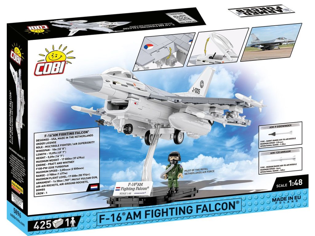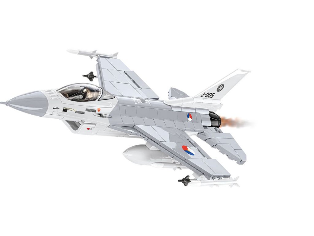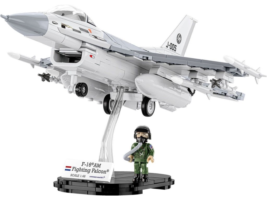 Se 425 kostkami stavebnice COBI můžete postavit nejoblíbenější stíhací útočný letoun na světě, F-16® AM FIGHTING FALCON® v holandských barvách (Dutch Air Force). Sada byla pečlivě navržena v modelářském měřítku 1:48 a kostky mají vysoce kvalitní potisky, v balení nenajdete žádné samolepky. Letoun má také podvěšené rakety AIM-9 SIDEWINDER a AIM-120 AMRAM. Výzbroj je odnímatelná a lze ji libovolně konfigurovat nebo umístit na jiné letouny z kolekce Ozbrojených sil (Armed Forces). Sada obsahuje figurku nizozemského pilota vybaveného helmou a kyslíkovou maskou s hadicí. Figurka má potisky s nášivkami nizozemského letectva a pilotů F-16. Celou sadu doplňuje výstavní stojánek s plaketou s názvem letounu, státní vlajkou a logem Lockheed Martin.