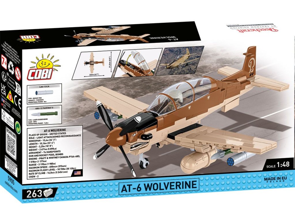 Postavte si model cvičného letounu AT-6 Wolverine. Model je v měřítku 1:48 a měří 22 x 8 cm a rozpětí křídel má 21,5 cm. Balení obsahuje 263 kostek stavebnice. Vyrobeno v licenci Beechcraft.
