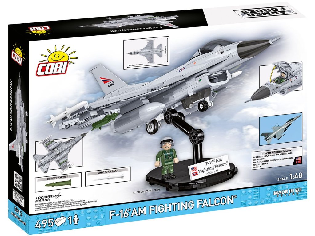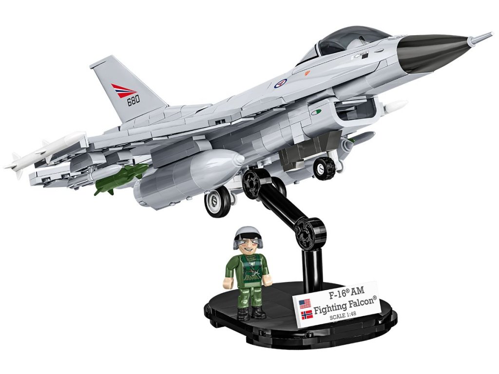 Postavte si model letounu F-16 Fighting Falcon v barvách Norského královského letectva. Model je v měřítku 1:48 a měří 31,5 x 11,5 cm a rozpětí křídel má 23 cm. Má mnoho funkčních částí. Balení obsahuje 495 kostek stavebnice a figurku pilota. Vyrobeno v licenci Lockheed Martin.