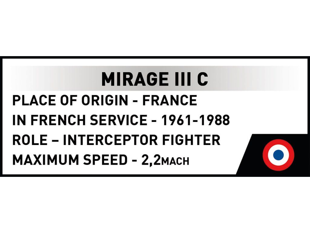 Mirage IIIC je detailní model jednoho z nejikoničtějších bojových letounů 20. století. Jeho dynamická silueta, delta křídla, realistická výzbroj a četné pohyblivé části dělají z této sady perfektní kombinaci stavění z kostek a poznávání historie moderního vojenského letectví.