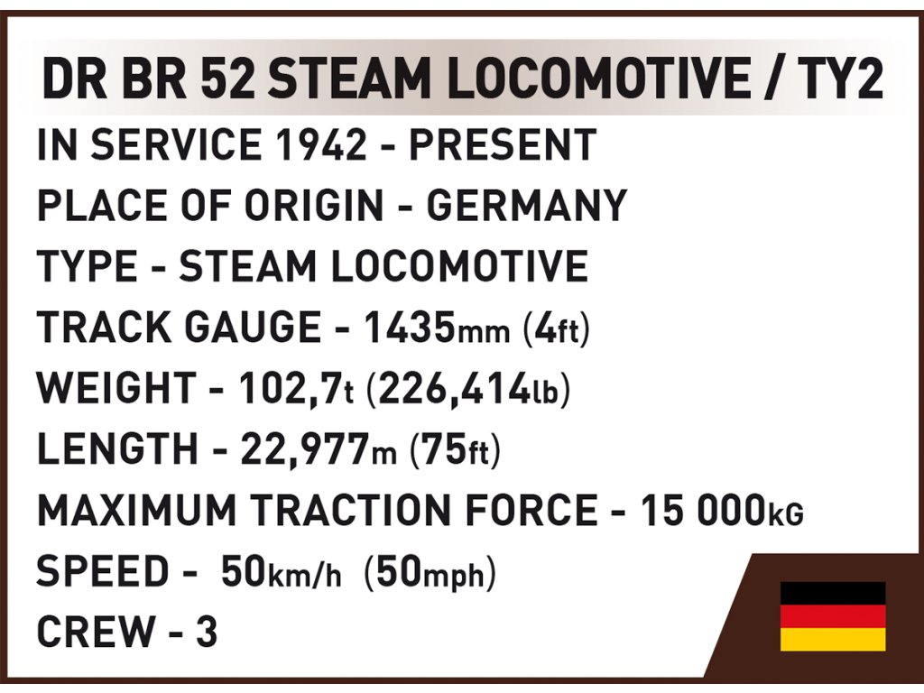 Tato sada je perfektním dárkem pro každého milovníka historie a železnice. BR 52 nebo Ty2 nebo Ty42 je nákladní parní lokomotiva německé výroby, vyráběná v mnoha evropských továrnách v letech 1942 - 1945. Byla to velmi levná, jednoduchá, a přesto velmi spolehlivá parní lokomotiva. V Polsku, stejně jako v Československu, byly používány po skončení války. Lokomotiva dokázala utáhnout nákladní vlak o celkové hmotnosti až 620 tun při rychlosti 80 km/h nebo 1700 tun při rychlosti 50 km/h. Lokomotivy byla také používány k tažení osobních vlaků.