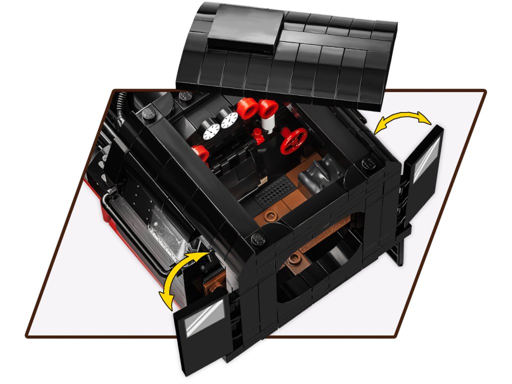 Model lokomotivy v měřítku 1:35 má kromě různých detailů, jako jsou symboly, číslování a značení, další četné potisky "budíků" uvnitř strojovny lokomotivy. Díky snadno odnímatelné střeše strojovny můžete nahlédnout dovnitř, abyste viděli věrně reprodukované detaily zařízení sloužících k pohonu lokomotivy. Povšimněte si i takového detailu, jako je imitace hořícího uhlí v ohništi!