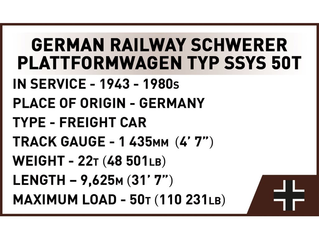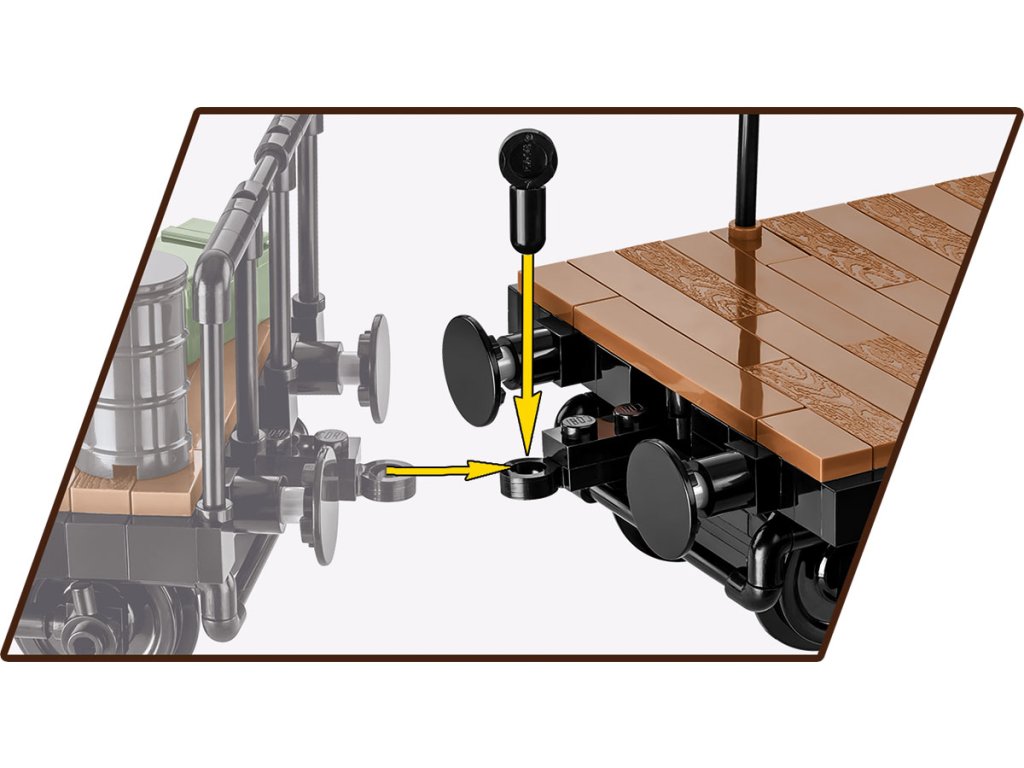 Postavte si model německého čtyřnápravového nákladního vagónu, navrženého pro přepravu vozidel a nákladů o hmotnosti až 50 tun, který byl pečlivě vyvinut v měřítku 1:35, aby odpovídal dalším modelům železniční a automobilové kolekce 20. století. Vagón je ideální pro přepravu tanků a vozidel z 2. světové války z kolekce COBI. Kromě pohyblivých vozíků a detailních potisků je atraktivním doplňkem tohoto modelu figurka německého železničního strážce s miniaturní lampou. Balení obsahuje 424 kostek stavebnice a 1 figurku.