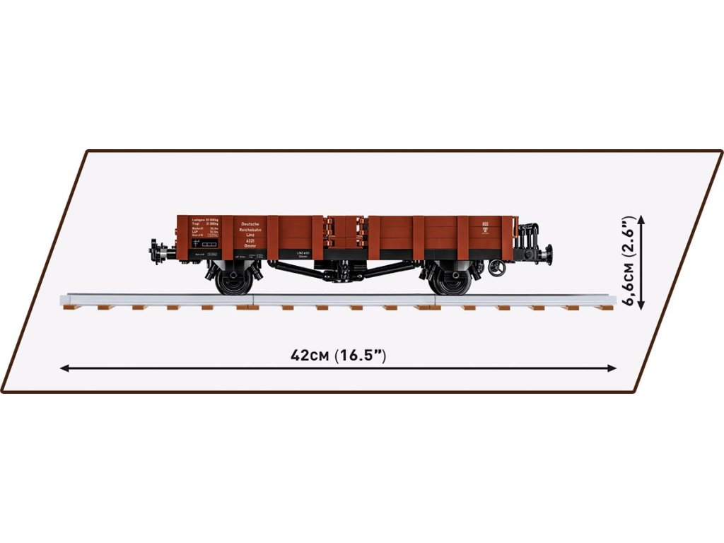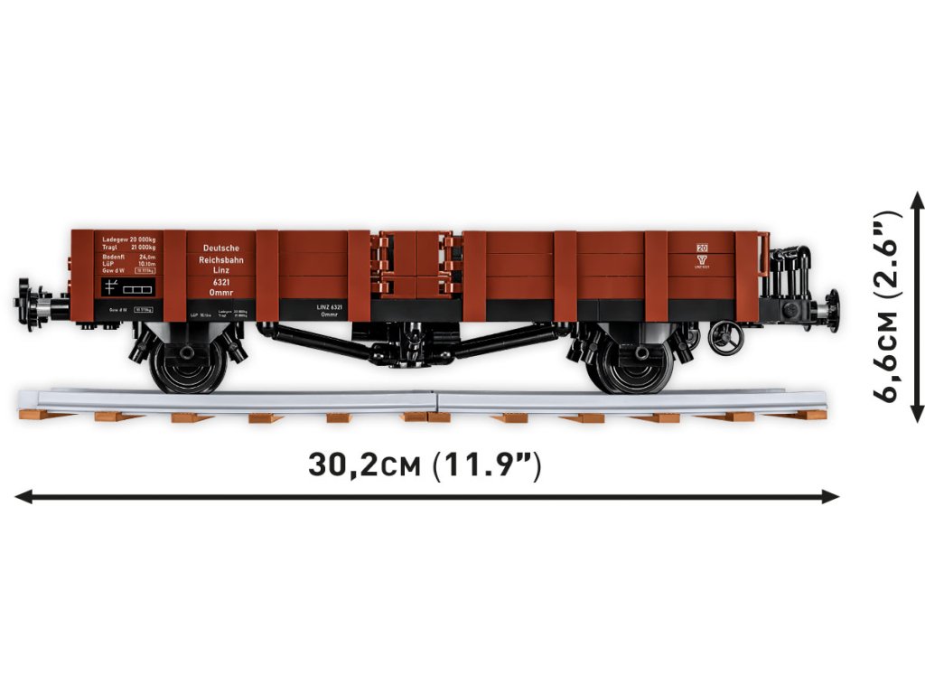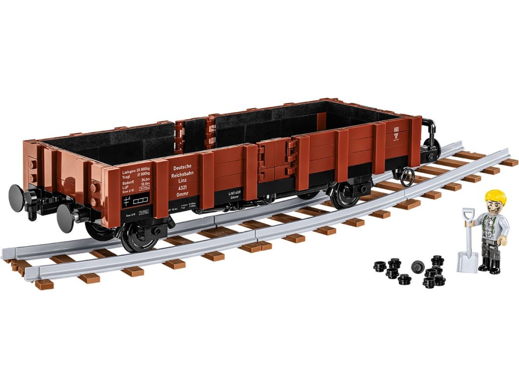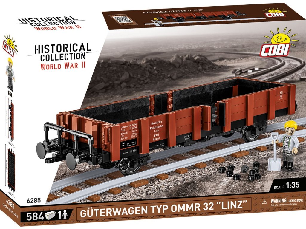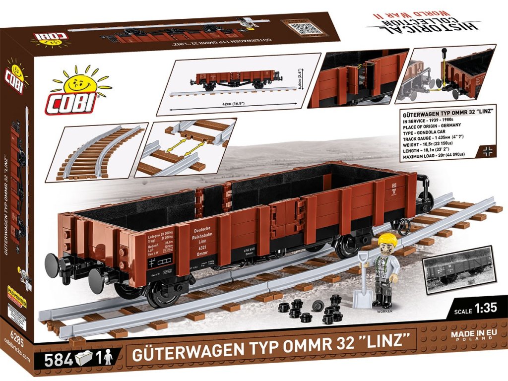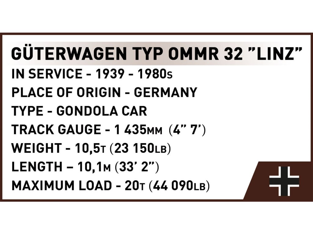 Postavte si nákladní vagón typu Ommr 32 „LINZ“, který byl navržen na konci 30. let 20. století. Jde o typickou dobovou techniku postavenou s ohledem na nadcházející ozbrojený konflikt v Evropě. Tento vůz byl určen pro přepravu vozidel a různého zboží, včetně nákladních automobilů, osobních automobilů, děl a především sudů a beden, ale i sypkých materiálů jako je uhlí. Jeho nosnost byla asi 25 tun. Balení obsahuje 584 kostek stavebnice a 1 figurku.