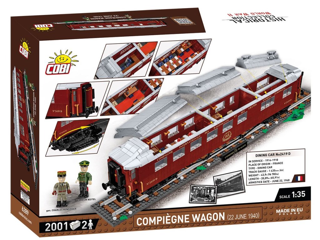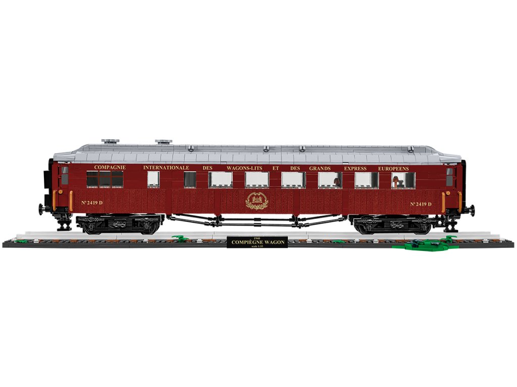 Postavte si model vagónu Compiègne z 22.června 1940. Model je v měřítku 1:35 a měří 58,5 x 9 x 13 cm. Má mnoho funkčních částí. Balení obsahuje 2 001 kostek stavebnice a 2 figurky.