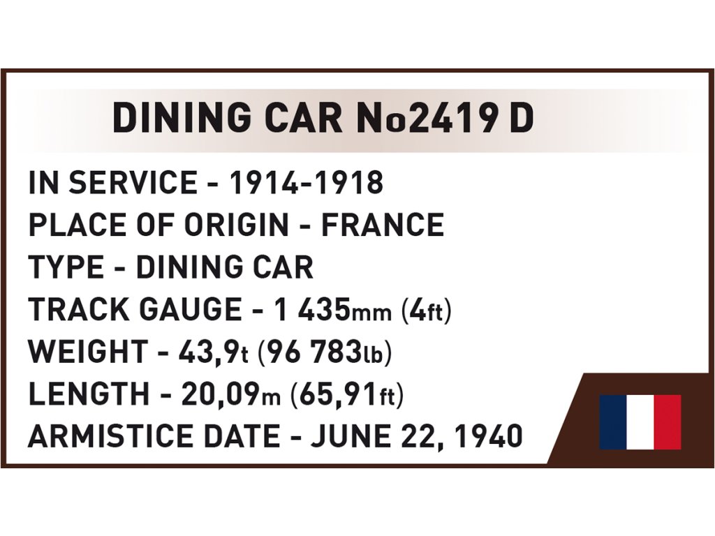 Téměř 60 cm dlouhý vagón byl navržen v měřítku 1:35 a ladí s dalšími modely železniční kolekce od COBI. Součástí modelu je přesně reprodukovaný interiér a potisky historického značení. Sada obsahuje postavy zobrazující zástupce stran, které podepsaly příměří. Na německé straně je to generál Wilhelm Keitela na francouzské straně generál Charles Huntziger. Vůz má speciální základnu sestávající z pěti kolejových prvků a profilovaného náspu s názvem modelu. Kolejnice od COBI jsou kompatibilní s kolejemi jiných značek stavebnic.