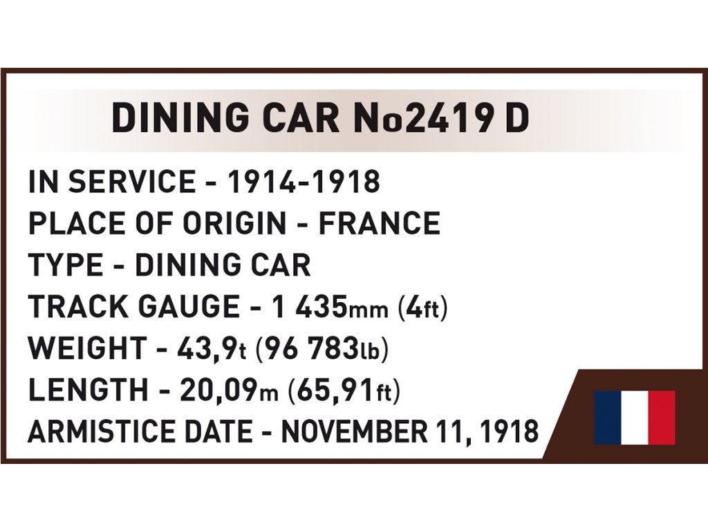 Téměř 60 cm dlouhý vagón byl navržen v měřítku 1:35 a ladí s dalšími modely z železniční kolekce od COBI. Sada obsahuje realistický interiér a krásné potisky historického značení. Sada obsahuje dvě figurky představující zástupce stran, které podepsaly příměří. Na německé straně je to Matthias Erzberger držící dokument a na francouzské straně maršál Ferdinand Foch.
